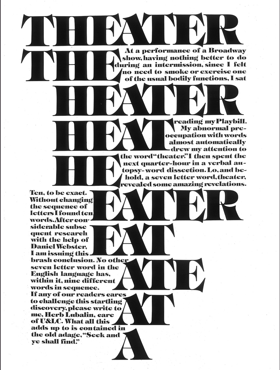 Herbert (herb) Lubalin was born in March of 1918, in New York City. With supportive parents and a keen interest in how typography can affect the world, Lubalin entered Cooper Union at the age of 17. Soon after graduating, he became particularly “fascinated by the look and sound of words (as he) expanded their message with typographic impact.”. After graduating in 1939, he worked as a freelance designer and typographer. He eventually landed a job at Sudler & Hennessey inc. In 1945. where he worked for 19 years working his way up to graphic design director.